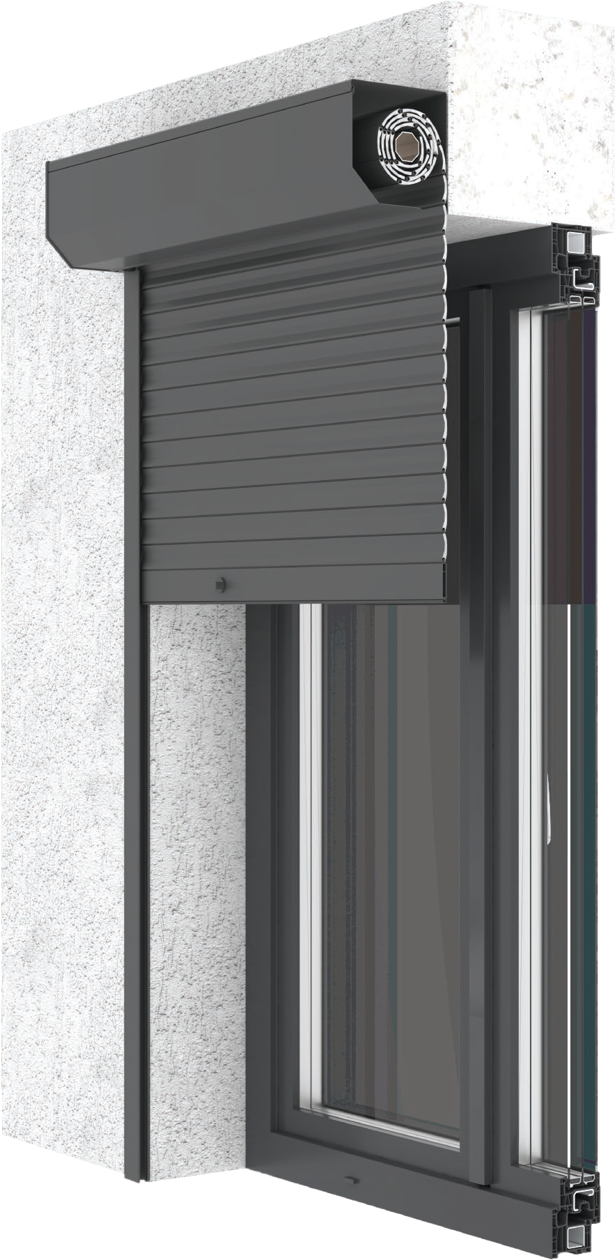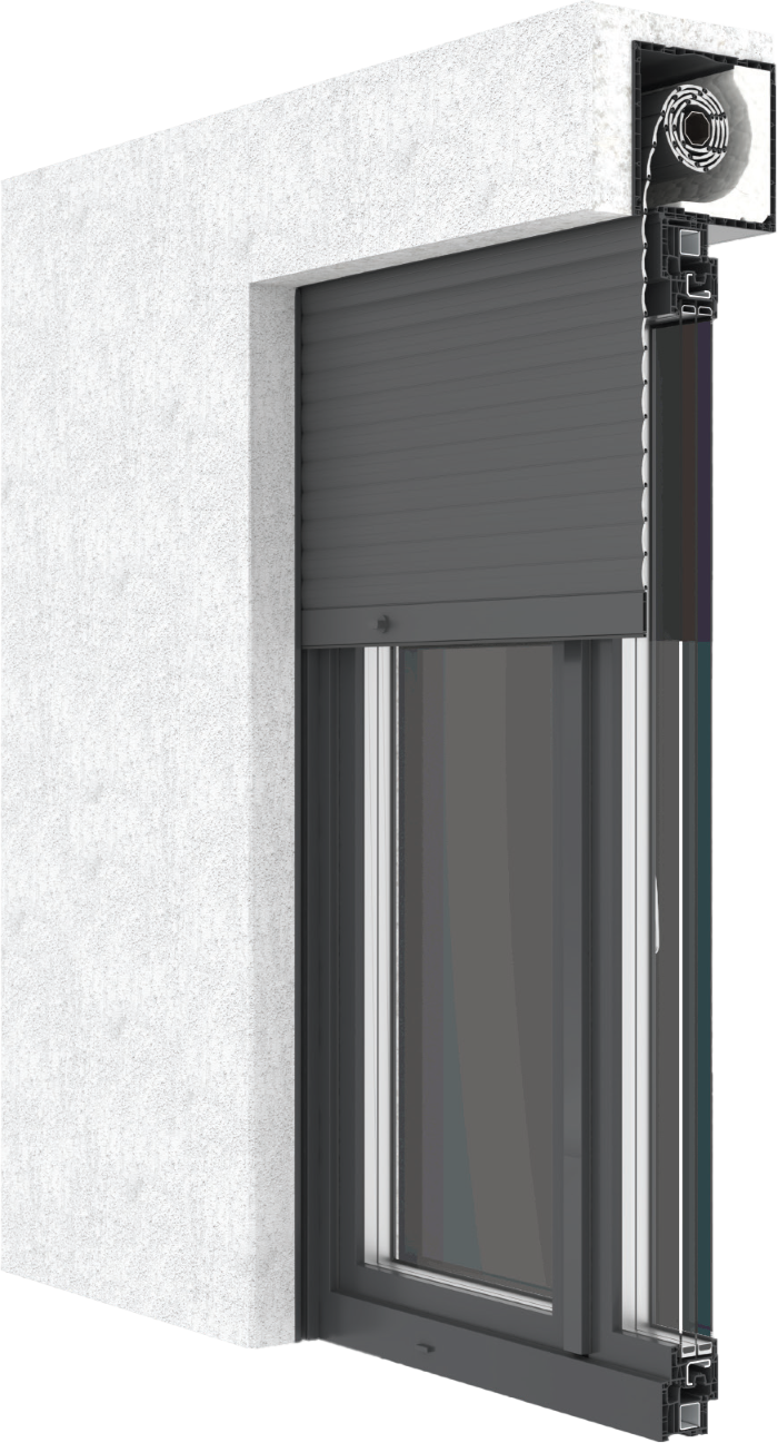 Ce système fait partie de la famille des volets roulants monobloc, dont l’installation consiste à installer directement le caisson sur le cadre du châssis avec un profil adaptable compatible avec le profil du châssis. Le caisson du volet roulant est constitué d’éléments en PVC de très haute qualité et son intérieur a été isolé davantage, augmentant ainsi l’isolation thermique, ce qui a été confirmé par des tests effectués à l’Institut IFT ROSENHEIM.